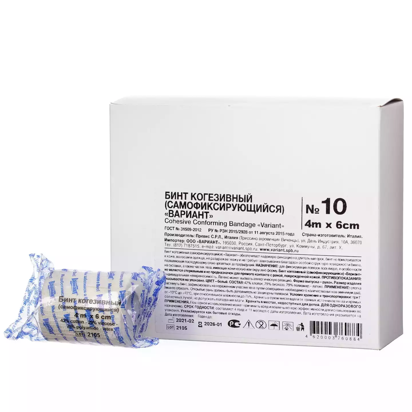 Бинт эластичный "Вариант" cамофиксирующийся когезивный, размер 4м*6см, цвет белый, упаковка 10штПревис С.Р.Л. (Италия) (ИТАЛИЯ)