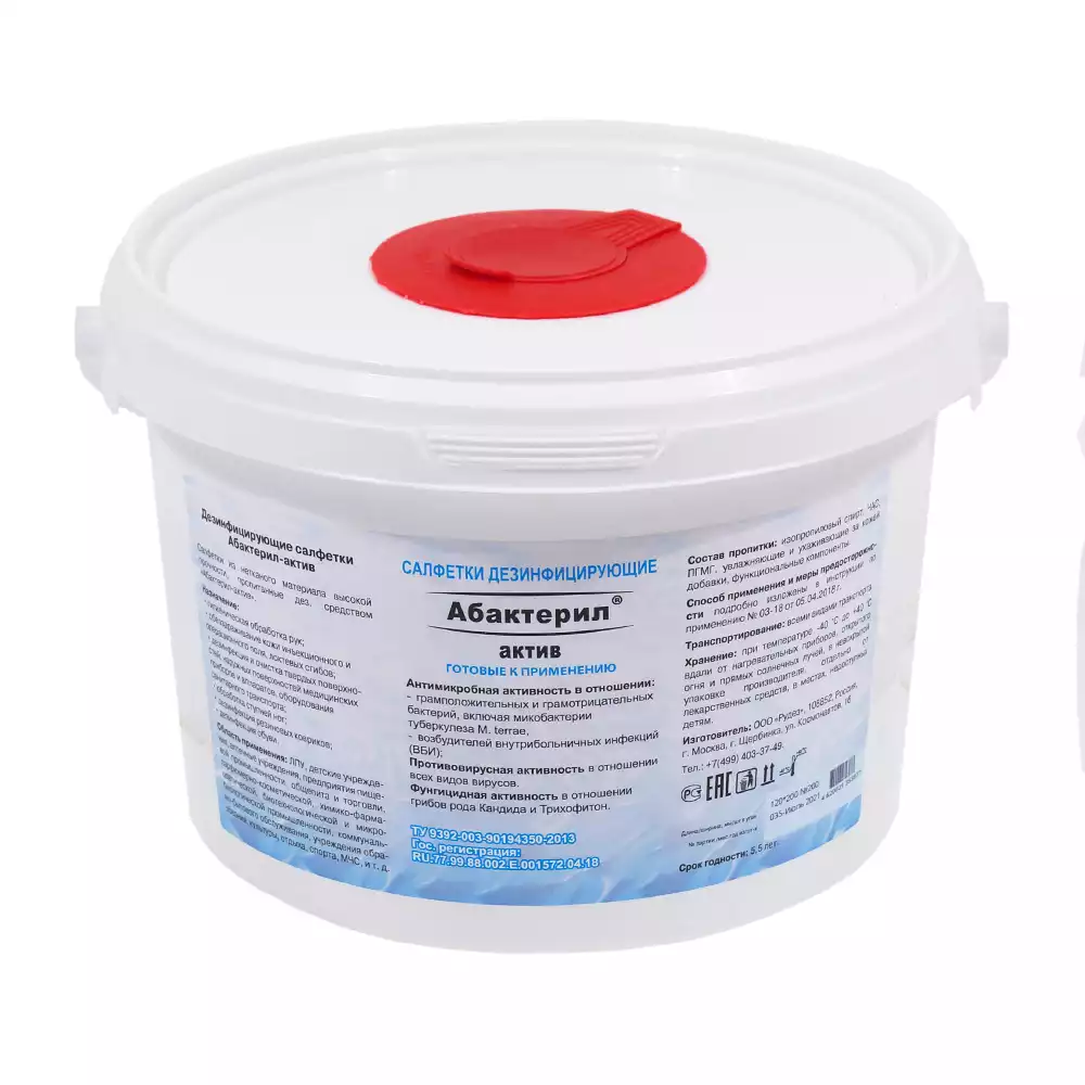 Салфетки "Абактерил - Актив", дезинфицирующие, размер 12*18см, в ведре 200шт, готовые к применениюРудез (РОССИЯ)