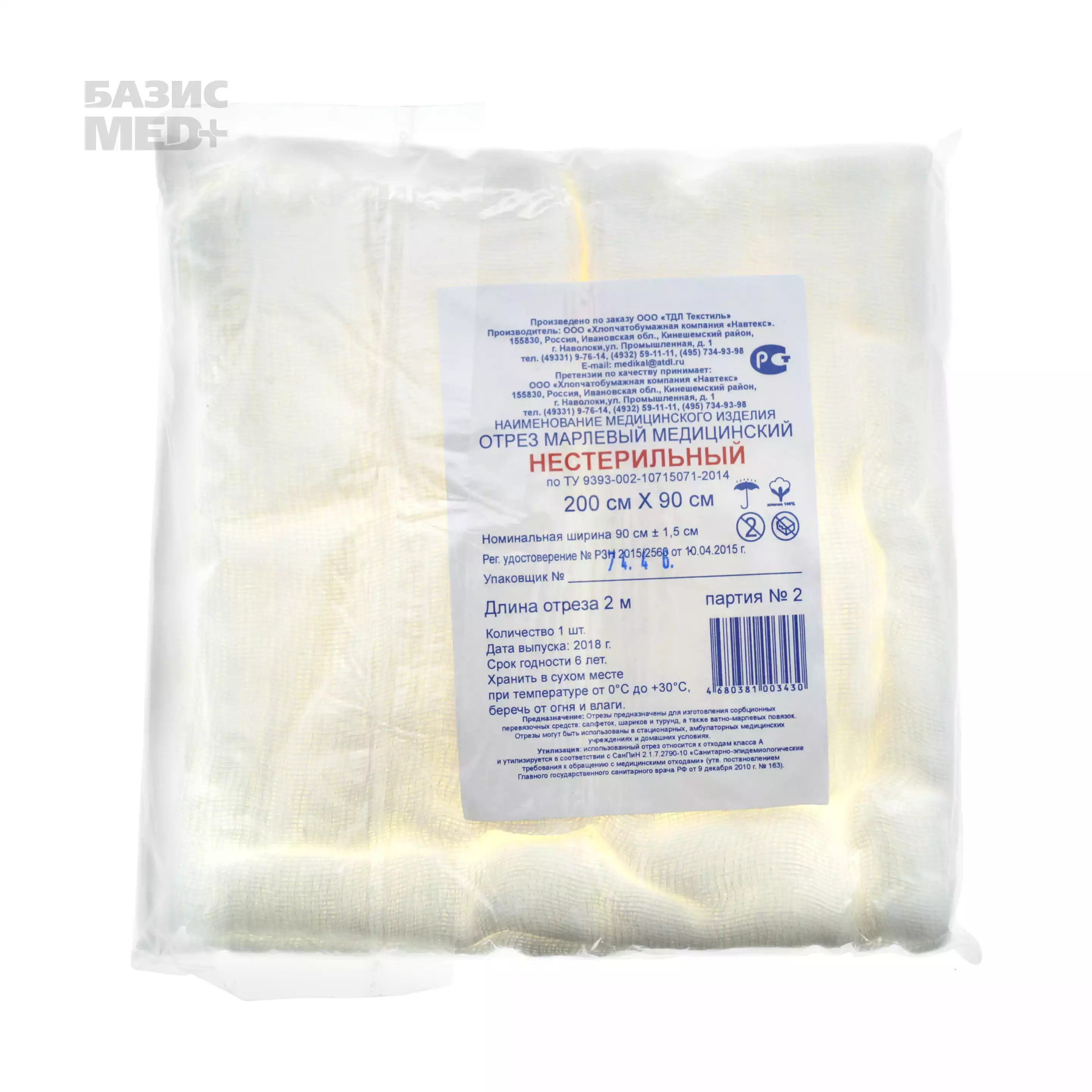 Марля медицинская, ширина 90см, отрез 2м, плотность 36г/м2Навтекс ХБК (РОССИЯ)