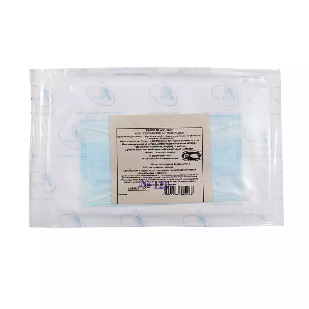 Маска 3-х слойная, с носовым фиксатором 10см, на резинке, стерильная, голубаяВолга Медикал НПП (РОССИЯ)