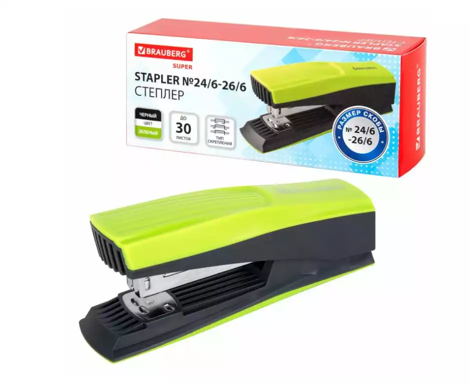 Степлер №24/6, 26/6 BRAUBERG "SUPER", до 30 листов, зелено-черный, BRAUBERG