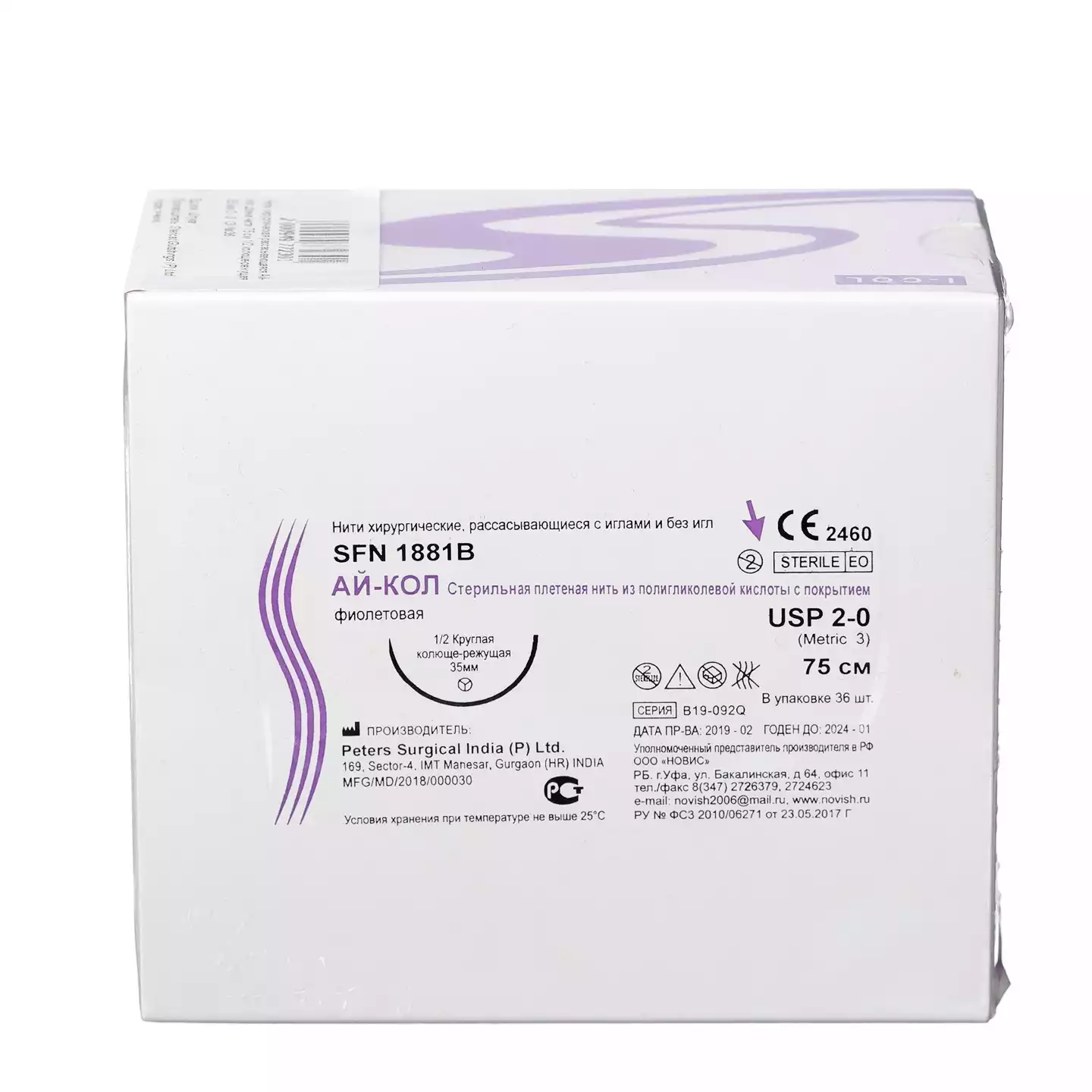 Ай- кол 2/0 (3), длина нити 75см, игла 1/2 колюще-режущая 35мм, упаковка 36шт, SEN 1881B, Peters Surgical (ИНДИЯ)