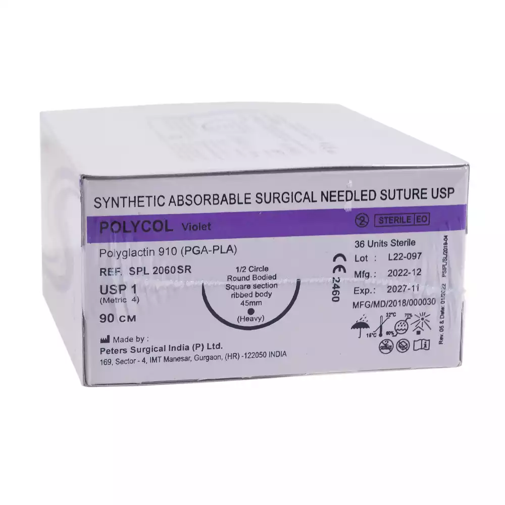 Поликол 1/0 (4,0), длина нити 90см, игла 1/2 круглая колющая тяжелая 45мм с продольными насечками, упаковка 36шт, SPL2060SR, Peters Surgical (ИНДИЯ)