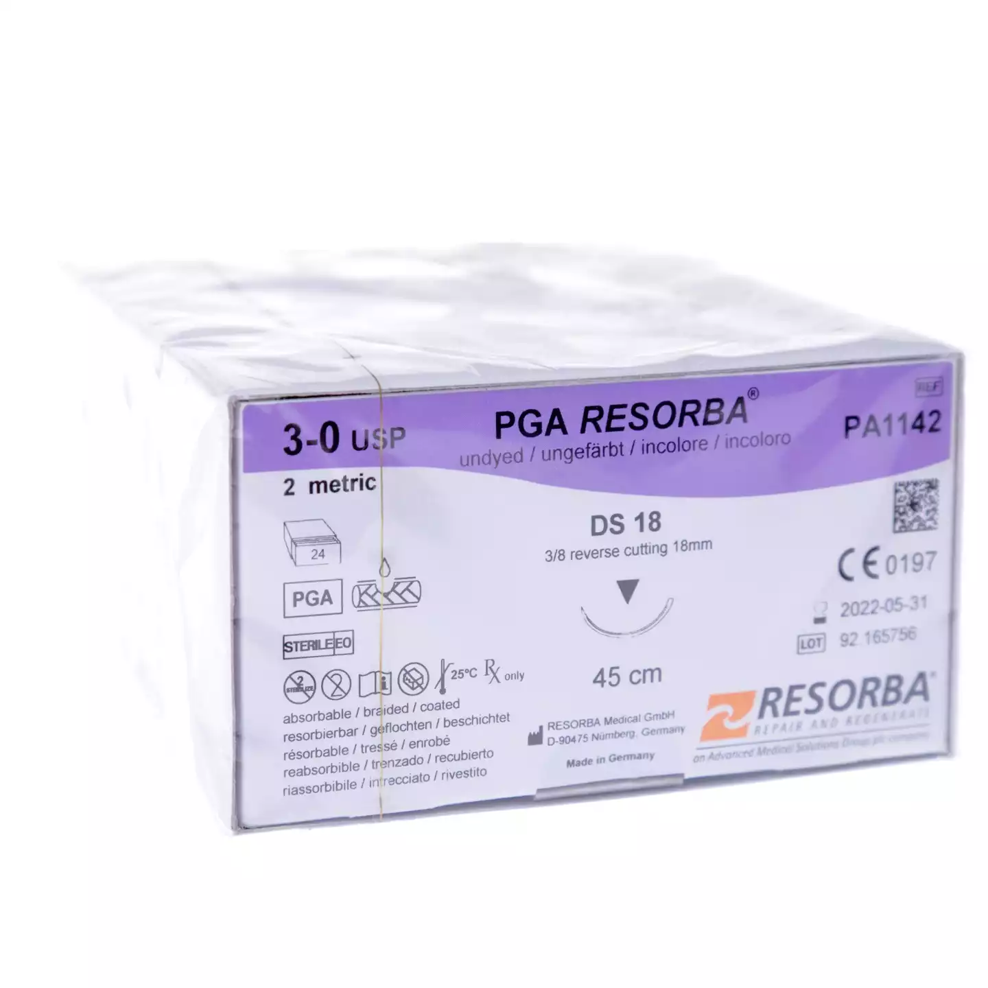 ПГА-РЕСОРБА (PGA) М2 (3/0), длина 45см, игла DS 18 режущая 3/8 круга, неокрашенный, упаковка 24шт, РА 1142, Resorba Medical GmbH (ГЕРМАНИЯ)