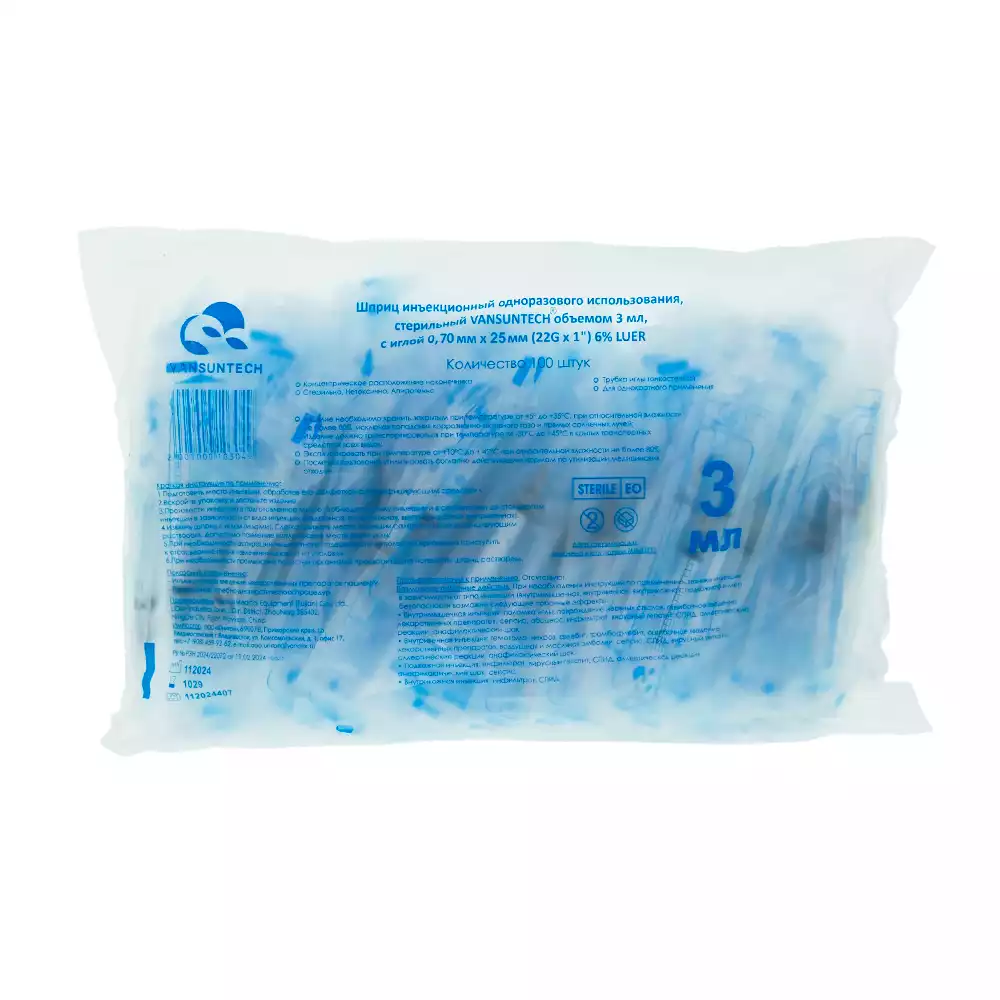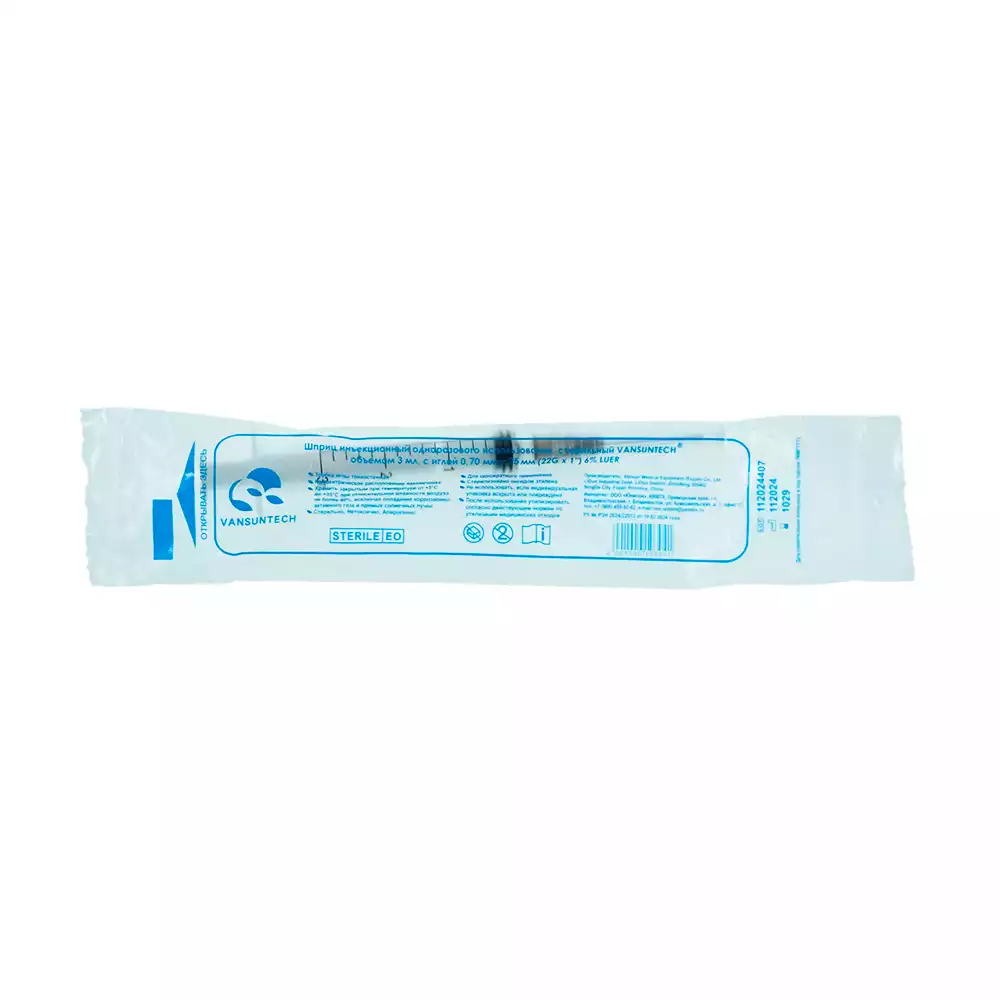 Шприц VANSUNTECH 3,0мл, 3-х компонентный, игла 22G*1 1/4 (0,7х25мм),стерильный, 100 шт